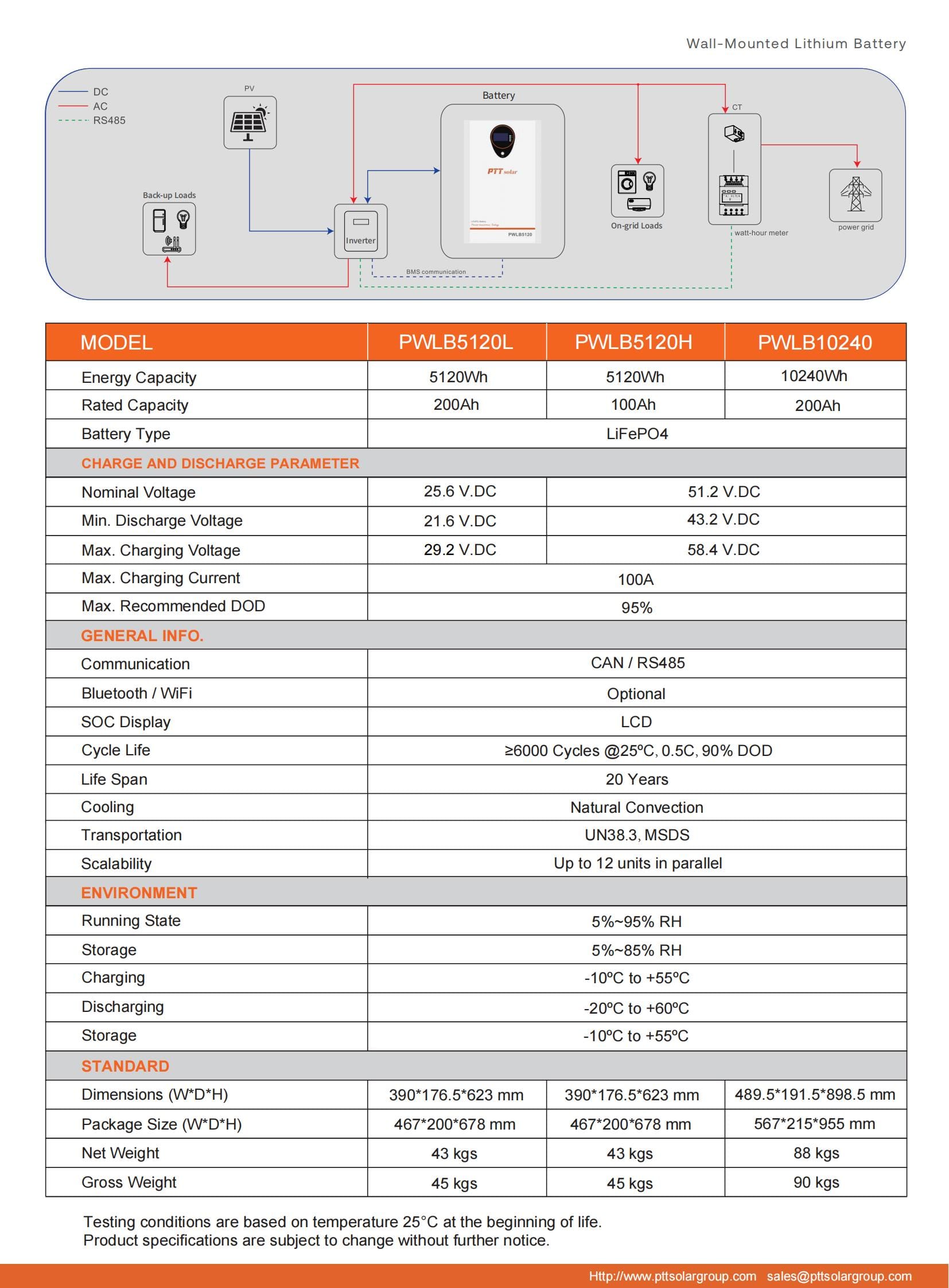 باتری لیتیوم 100 آمپرساعت 51.2 ولت 5 کیلووات مدل PWLB5120H برند PTT SOLAR